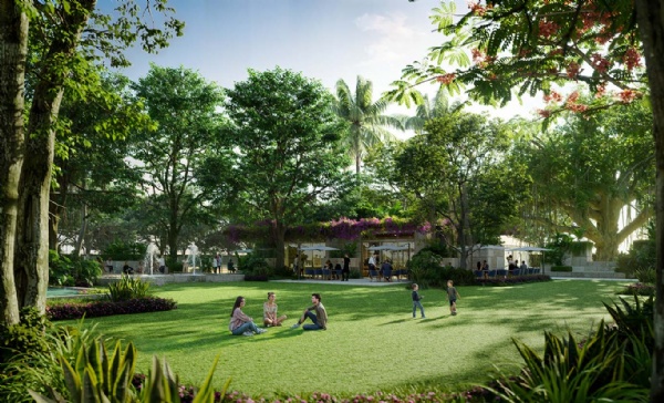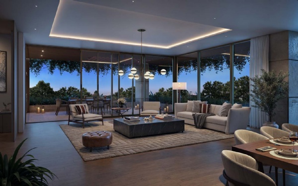 This rare collection of luxury homes creates a private oasis, with meandering garden pathways and a landscaped interior courtyard designed by Naturalficial’s Andres Arcila. Developed by The Allen Morris Company and envisioned by Oppenheim Architecture, the three-story mixed-use landmark will feature a distinctive pyramid form, merging modern architecture with natural materials, rich greenery, and a warm, earthy palette.