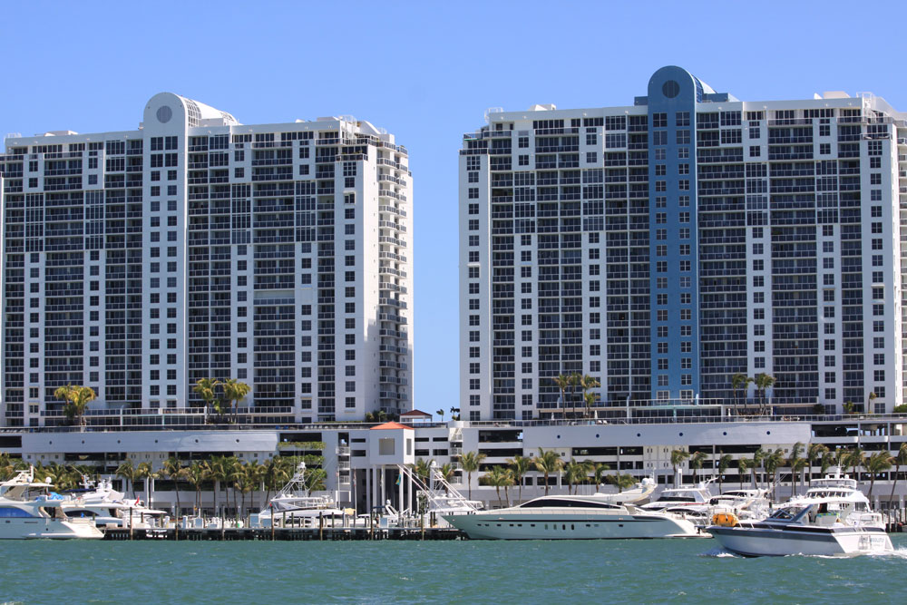 The Sunset Harbour South in Miami Beach one of two buildings rising 25 stories just south of the four land masses better known as the Sunset Islands. Both buildings are located in a northeastern corner that allows residents of Sunset Harbour South to enjoy views of the Sunset Islands quartet, Biscayne Bay, the six Venetian Islands and the Miami cityscape across the bay to the west.