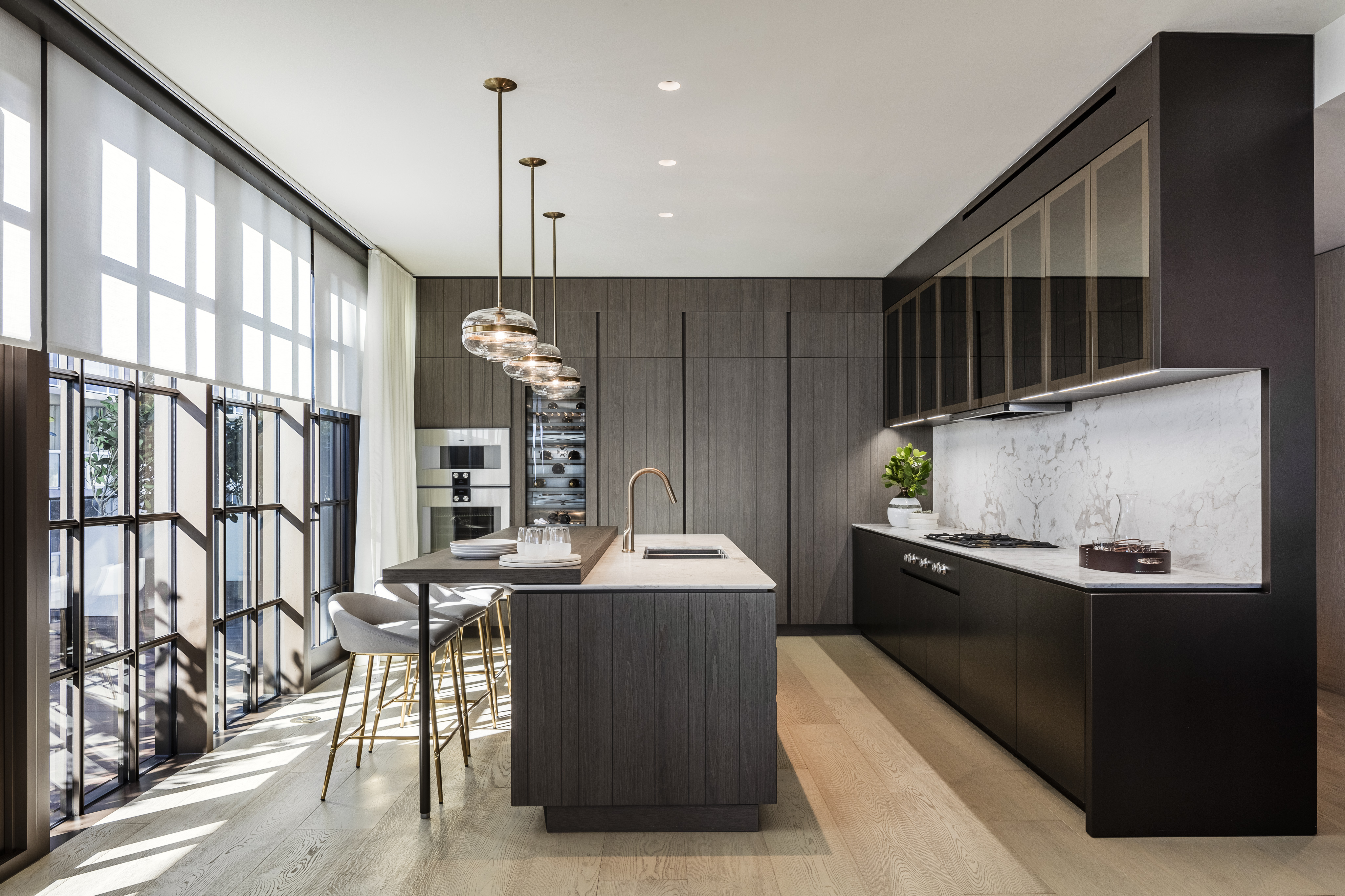 • The exclusively designed kitchens and accessories by Antonio Citterio establish the sculptural centerpiece of each residence. The dramatic cantilevered Cenere oak breakfast tables, Poliform Cenere oak cabinetry with brushed bronze lacquer and glass detailing.