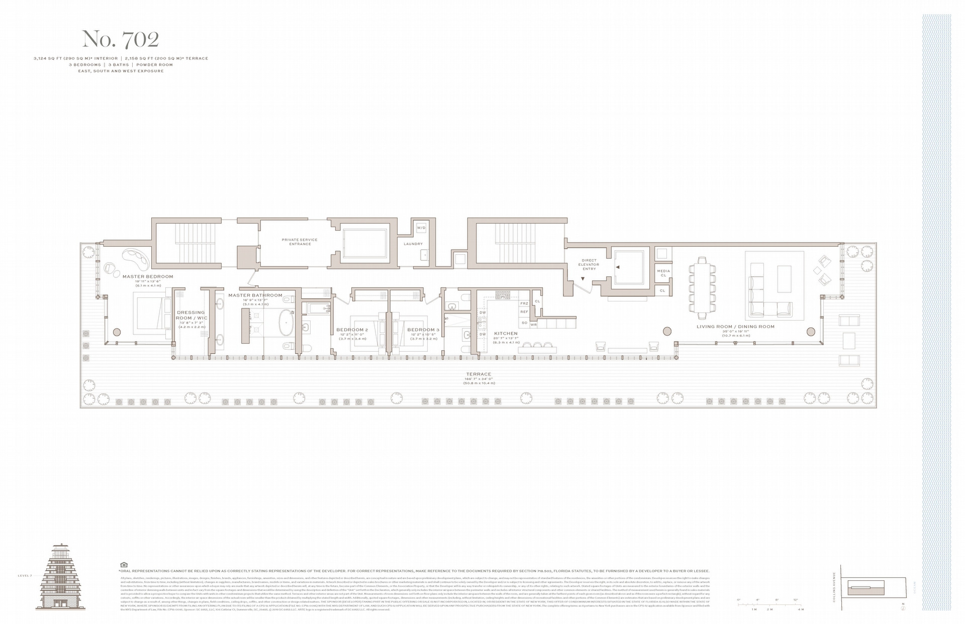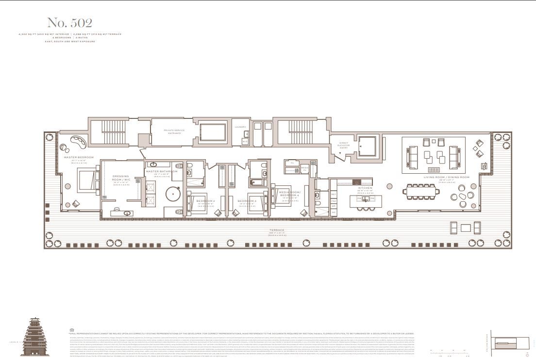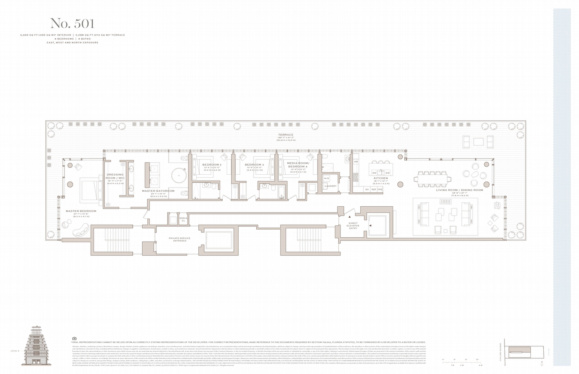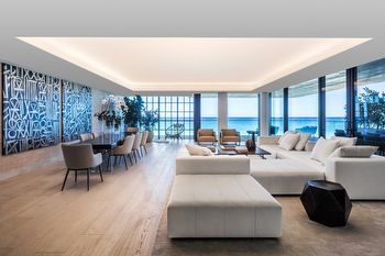 Residence features include direct elevator entry with fingerprint recognition technology, floor to ceiling bronze Schuco gridded insulated and laminated glass wall system. Wraparound terraces with Roman travertine ceilings and Brazilian Ipe decks, and expansive living, dining and entertaining area with Roman travertine accent wall and linear cove lighting. Flooring is luxurious 11” wide 10-foot long Italian White Oak with brushed pearl finish.