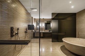 • Roman travertine slab floors and walls with bamboo finish accent walls